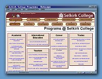 We were hired to design and implement a database-driven web site for the programs offered at Selkirk College. We also designed the outline for the navigation system. The actual content and other design of the site are under the control of the College itself. Our goal was to create a system that would be easy for their webmaster to maintain and add to. The database portion involved interfacing Microsoft SQL Server to the web using Cold Fusion. (Our design has not yet been implemented by Selkirk)